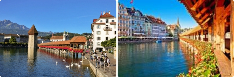 ▶곤돌라를 타고 하산 - 베기스로 하산 ▶유람선을 타고 루체른 으로 이동 ▶카펠교,무제크 성벽,박물관,미술관등 시내관광 ● 오래된 목조다리로 1333년에 로이스강 위에 제작 되었으며 유럽에서 가장 오래되고 긴 나무다리이다. ● 빈사의 사자상 많은 전쟁에 참전하여 용맹함을 인정 받았던 스위스의 용병을 기리기 위해 만들어진 사자상. ● 무제크성벽 거리를 둘러싸고 있던 성 유적으로 성 위에서는 거리와 호수를 한눈에 바라볼 수 있습니다. |