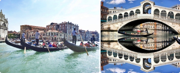 ▶곤돌라 탑승 관광 ● 베네치아 운하에서 볼 수 있는 곤돌라는 과거에는 부자 상인이나 귀족들이 부를 과시하기 위해 호화롭게 꾸몄다고 합니다. 하지만 1562년 공화국 정부의 명령으로 지금과 같은 작고 날렵한 모양으로 바뀌었습니다. 곤돌라의 노를 젓는 일은 상당한 숙련을 요하여 보통 약 3년정도 훈련을 받은 후에 독립하며, 대운하에서는 배들의 항해에 지장이 없도록 50여 개만 운행 허가를 내줍니다. ▶수상버스 탑승 관광 석식 후 자유시간 |