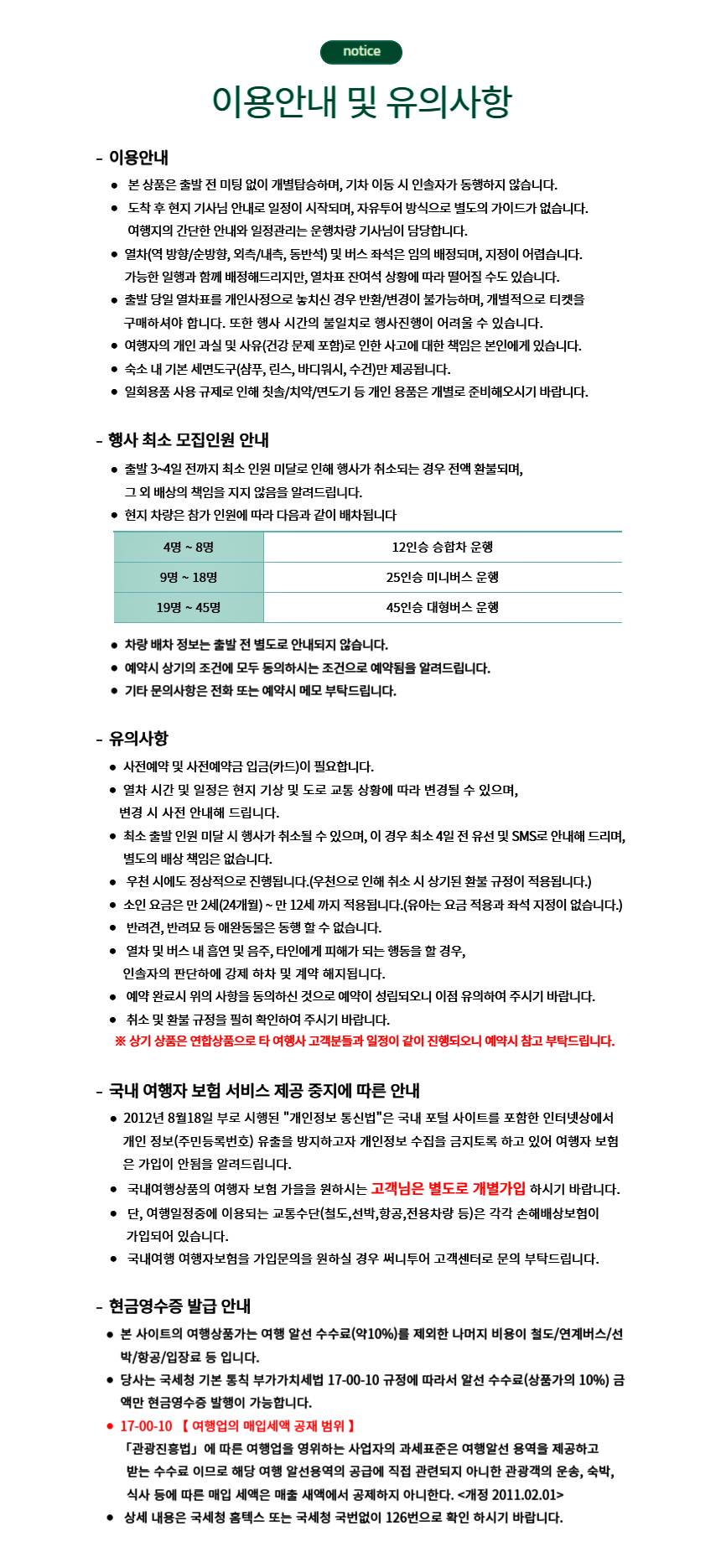 불포함내역 전일정 식사, 기타 개인경비, 국내여행자보험
