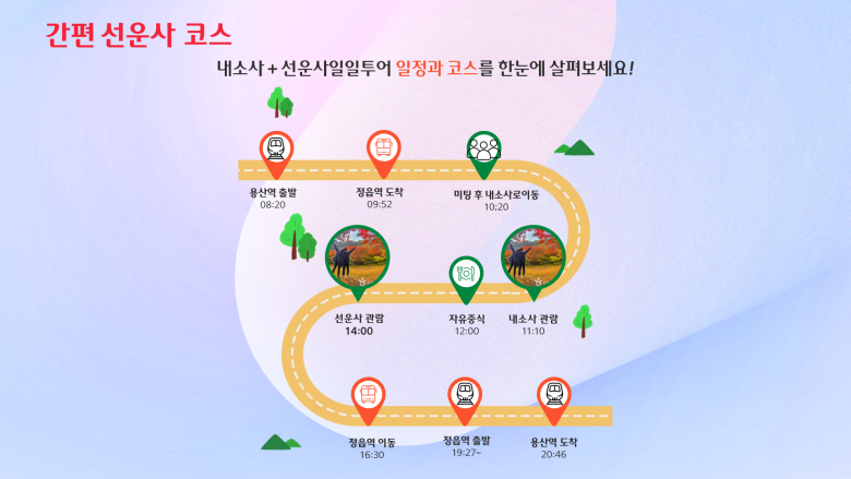정읍역 광장 오른쪽 버스정류장 현지 인솔자 미팅 - 연계차량 탑승 내소사로 이동 ※ 연합 행사로 대기 시간이 있을 수 있습니다. |