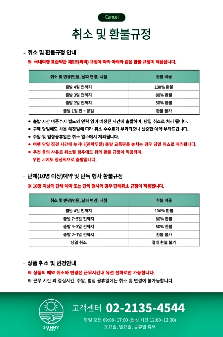 ♠ 사전예약 및 사전예약금 입금(카드)이 필요합니다. ♠ 열차시간 및 일정은 현지의 기상 사정 및 도로교통 여건에 의하여 변동이 있을 수도 있습니다. ♠ 변경시 사전에 통보하여 드립니다 ♠ 최소 출발인원 미달 시 행사가 취소 될 수 있습니다 최소 4일 전 유선 및 SMS로 연락드립니다. -모객이 되지않아 취소시에는 쌍방 원칙에 따라 배상의 책음을 지지 않음을 알려드립니다. ♠ 우천시에도 정상적으로 진행됩니다. (우천의 사유로 취소 시 상기의 환불 규정이 적용됩니다.) ♠ 소인 요금금은 만 2세(24개월)~만12세 까지 정용됩니다.(유아는 요금적용과 좌석지정이 없습니다.) ♠ 반려견, 반려묘 등 애완동물은 동행 할 수 없습니다. ♠ 열차& 버스 내 흡연 및 음주, 타인에게 피해가 되는 행동을 할 경우 인솔자의 판단하에 강제 하차 및 계약 해지됩니다. ♠ 예약 완료시 위의 사항을 동의하신 것으로 예약이 성립되오니 이점 유의하여 주시기 바랍니다. ♠ 취소및 환불 규정을 필히 확인하여 주시기 바랍니다. ※상기 상품은 연합상품으로 타 여행사 고객분들과 일정이 같이 진행되오니 예약시 참고 부탁드립니다. |